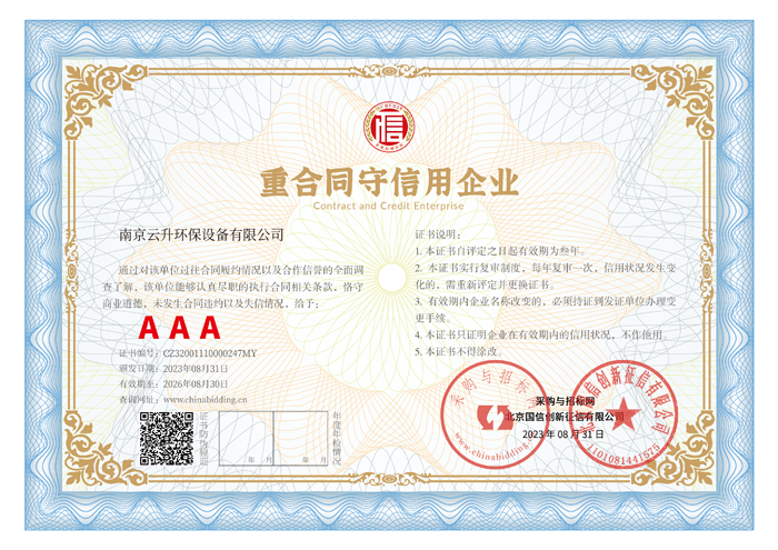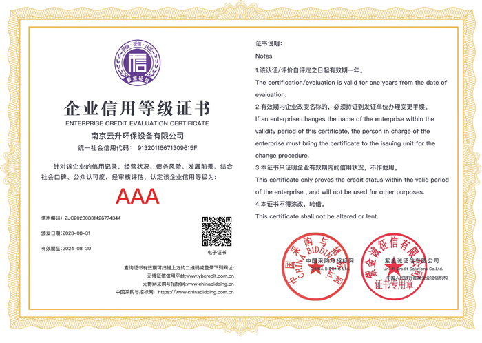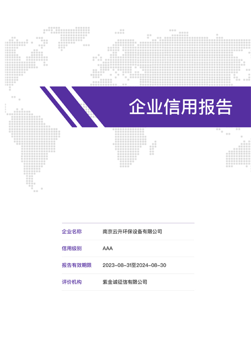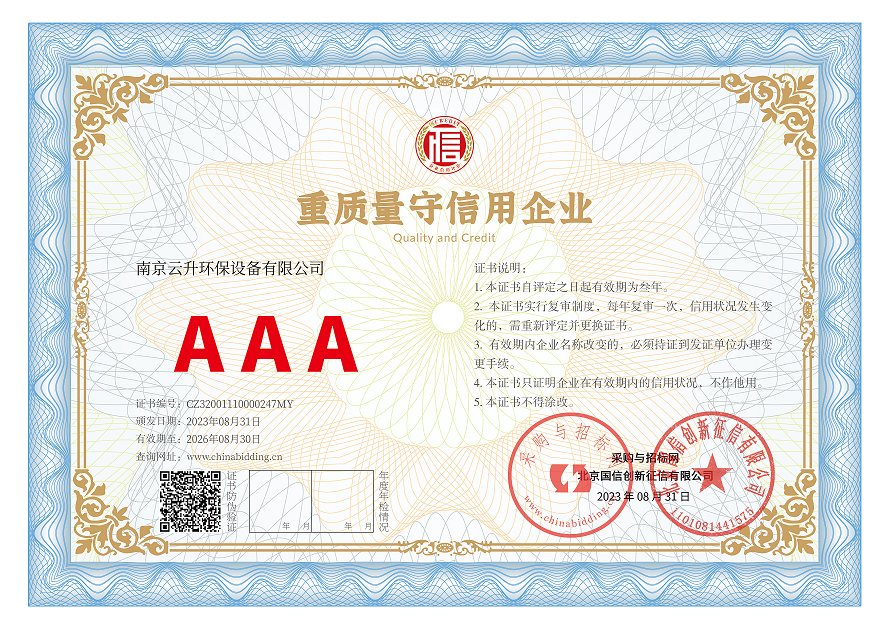 南京云升環(huán)保設備有限公司全體員工愿以環(huán)境保護為己任,以市場為導向,以優(yōu)質(zhì)服務為原則,嚴格的管理、先進的生產(chǎn)工藝、至上的品質(zhì)、完善的售前售后服務,與廣大新老用戶攜手并進,共鑄輝煌。公司已通過ISO9001:2000質(zhì)量管理體系標準認證,成為江蘇省高新企業(yè),并進行不斷的技術(shù)改進和創(chuàng)新,為客戶和合作伙伴提供滿意的產(chǎn)品。
