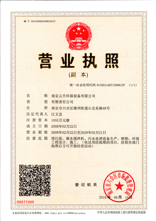 專業(yè)的各類水處理工程、水處理專用設備及泵類產(chǎn)品生產(chǎn)服務商南京云升環(huán)保設備有限公司占地面積二萬三千五百平方米,建筑面積約七千八百平方米,現(xiàn)有員工195名,各類工程技術(shù)人員41人,其中中高級以上22人,企業(yè)擁有各類大型專用機械72臺套,其中試驗臺3套,動靜平衡機4臺,各類機床28臺,CNC數(shù)控車床4臺,各類焊接設備19臺,各類起吊設備8臺套,交通、運輸工具8輛,為產(chǎn)品開發(fā)、生產(chǎn)制造、質(zhì)量控制、快速服務提供了強有力的保障。南京云升環(huán)保設備有限公司全體員工愿以環(huán)境保護為己任,以市場為導向,以優(yōu)質(zhì)服務為原則,嚴格的管理、先進的生產(chǎn)工藝、至上的品質(zhì)、完善的售前售后服務,與廣大新老用戶攜手并進,共鑄輝煌。